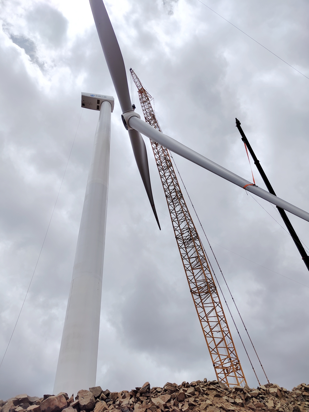 施工人员介绍,刚刚运输过来的风机塔筒,路上耗时两个多月。这些零部件从运输到安装,需要克服当地复杂地理环境、恶劣气候条件等诸多考验。