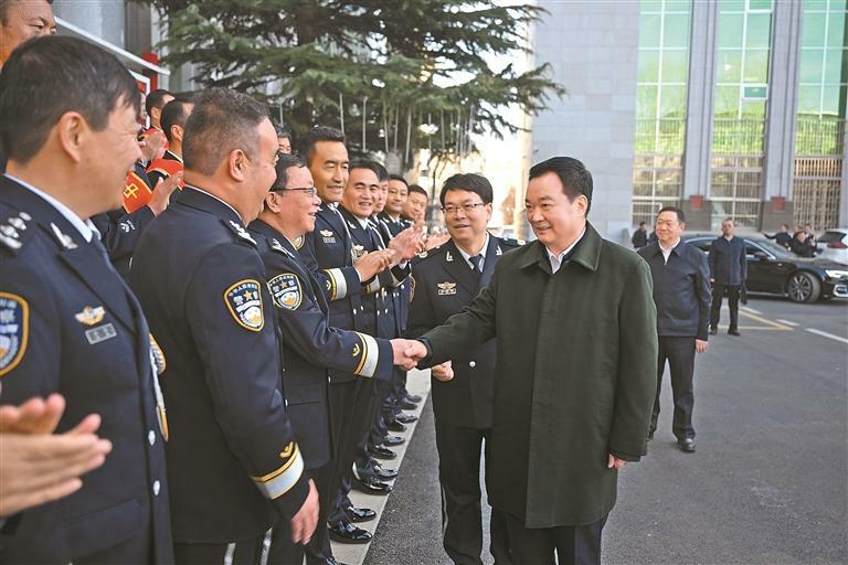 近日,自治区党委书记王君正来到自治区公安厅看望公安民辅警,代表自治区党委、政府向大家致以第六个中国人民警察节的节日问候和崇高敬意。本报记者 旦增西旦 摄